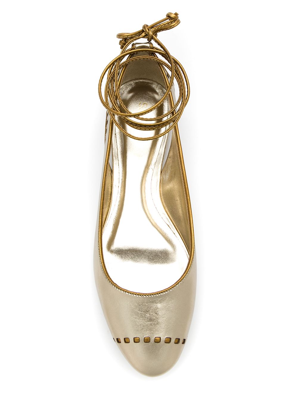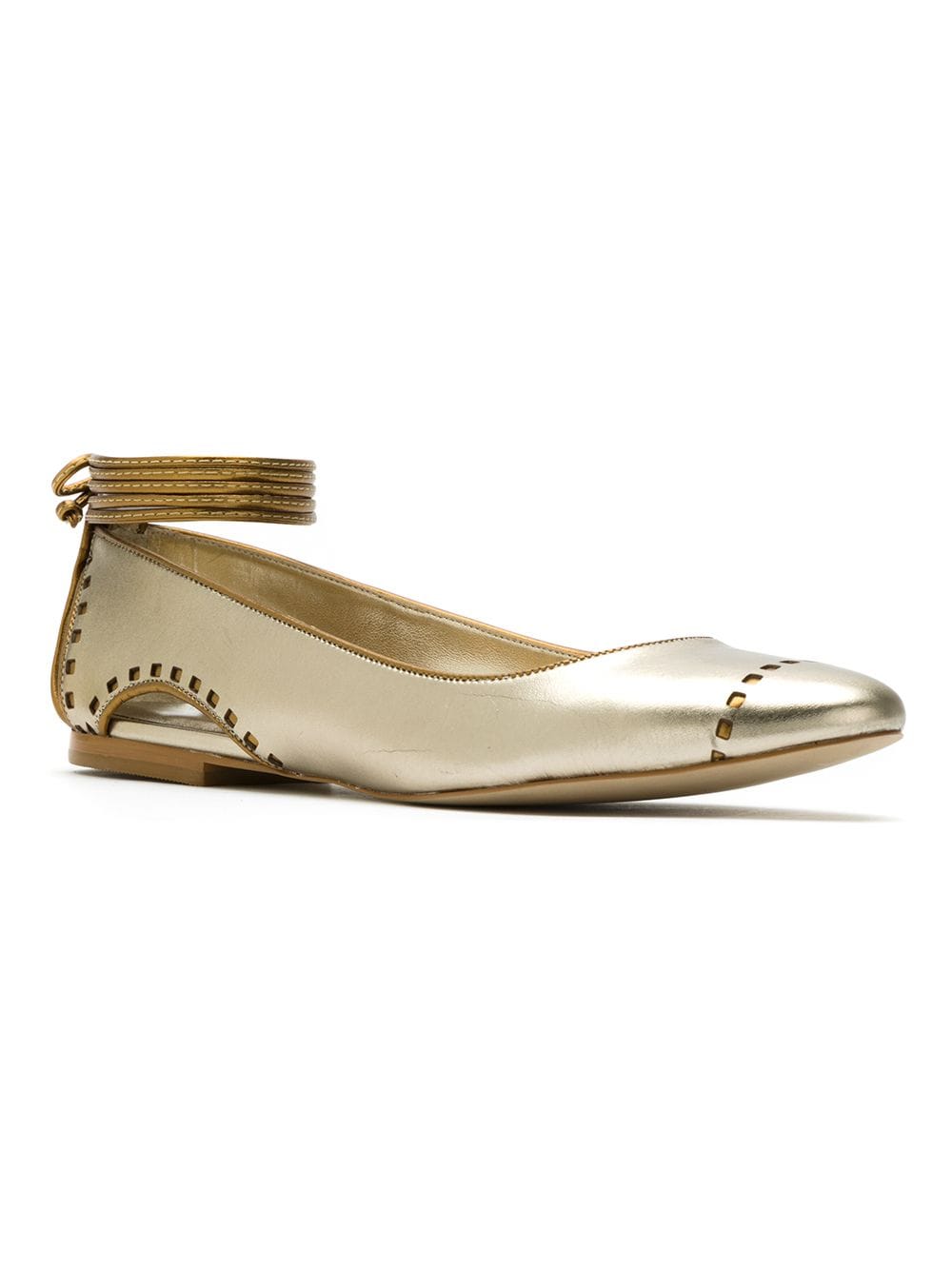 Sapatilha de couro metalizada prateado envelhecido, Sarah Chofakian. Com bico arredondado, detalhe de recortes, amarração no tornozelo e salto baixo.