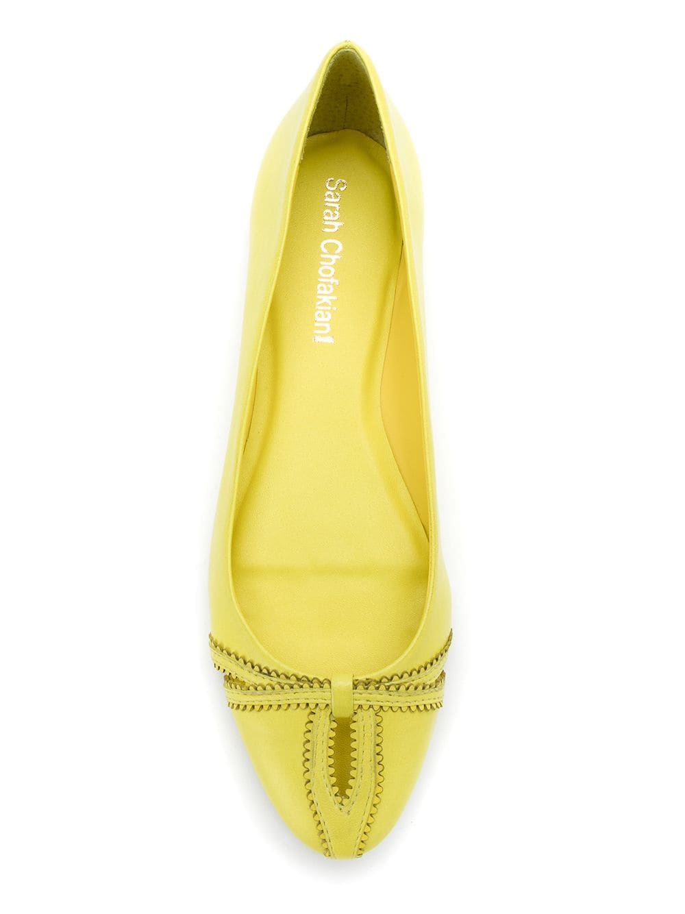 Sapatilha Pati de couro amarela Sarah Chofakian. Com bico arredondado, cabedal em couro, recortes pespontados com acabamentos ondulados frontal, recortes vazados no bico, palmilha levemente acolchoada, solado 100% couro, salto flat emborrachado e efeito glossy.